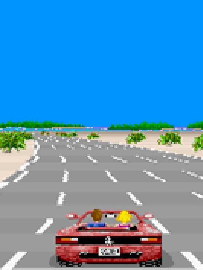 Eso es Out Run: un rápido paseo para vacilar a una tía buena en un Ferrari. Quizás paso de los coches, pero las tías buenas sí que me gustan y, hasta Out Run, ningún juego de coches me había ofrecido tías buenas salvo para la entrega de trofeos, algo que no solía estar a mi alcance gracias a que soy muy torpe conduciendo, tanto en la vida real como en los videojuegos. Comparando con mis experiencias anteriores, en las que no había otro aliciente que competir contra otros vehículos o superar nuestra velocidad y cuyo mayor atractivo gráfico que las curvas y los cambios de rasante de la calzada y ver como las bandas laterales, siempre rojas y blancas, imprimían la sensación de velocidad, el arcade de SEGA salía ganando.