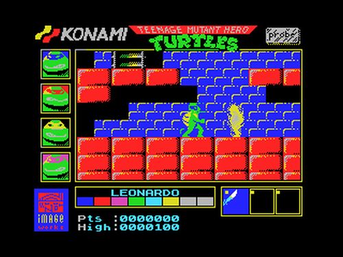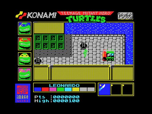 La versión de NES del juego de las Tortugas Ninja es harto conocida. Lo que menos personas saben es que los ordenadores domésticos de 8 bits (Spectrum, Amstrad, Commodore64 y MSX) recibimos una versión capada de ese juego para saciar nuestras ansias tortugueras y vaciar nuestras huchas. El planteamiento era el mismo: han secuestrado a April O’Neal (otra de las eternas doncellas en apuros) y Shredder en un ataque de buen rollo nos da la oportunidad de rescatarla si derrotamos al Clan del Pie. La mecánica era idéntica al juego publicado para la sobremesa de Nintendo: explorábamos la ciudad de Nueva York desde una pantalla de vista cenital que se volvía lateral cuando entrábamos en las alcantarillas y edificios visitables, seleccionando a nuestra tortuga favorita para repartir kung-fu entre los ninjas del clan del pie. A pesar de las similitudes, el mapa y las localizaciones eran nuevas lo que daba lugar a un juego menos hijoputamente difícil que su versión de NES, una de las cosas más recordadas de ese título.