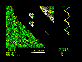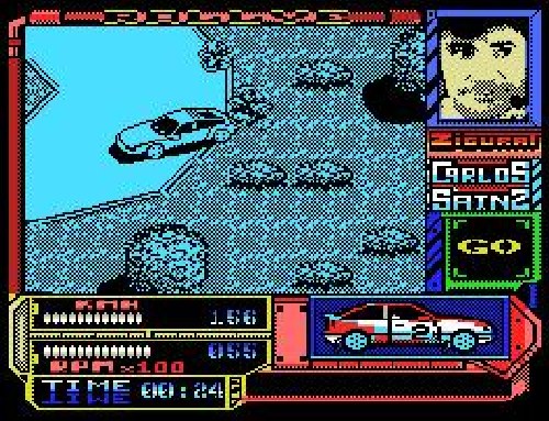 Abandonamos las motos pero no el motor. Antes de adquirir su inmerecida fama de gafe, Carlos Sainz llegó a los ordenadores domésticos con Carlos Sainz Campeonato de Rallies (Zigurat, 1990) en el que se repite la perspectiva isométrica de Sito Pons 500 c.c. Un juego vistoso gráficamente pero que no contaba con la suavidad de scroll ni jugabilidad necesaria para considerarlo un buen juego. Por lo menos, no había bromas sobre “¡Trata de arrancarlo, Carlos!”