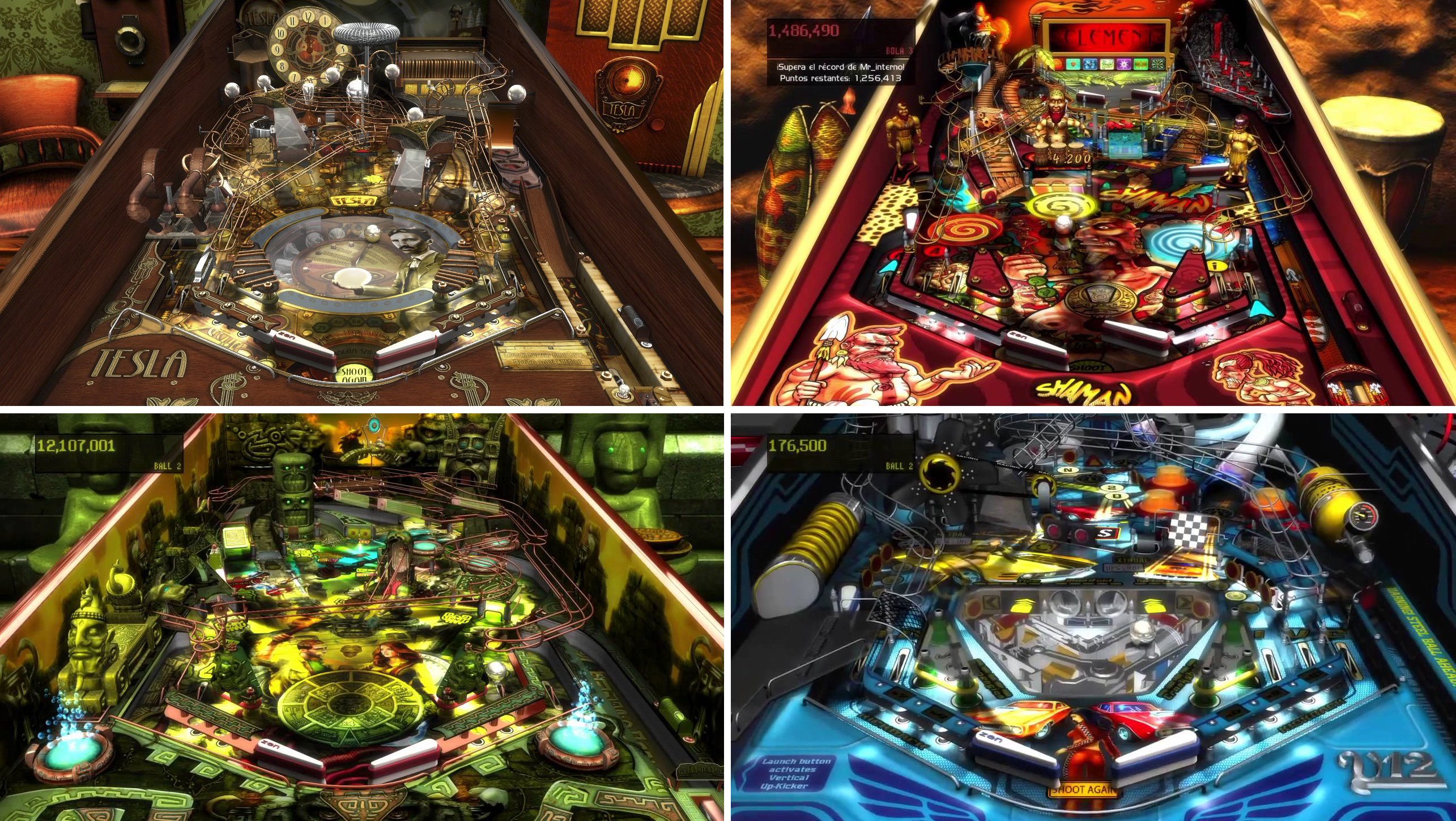Del pack iniciático tan sólo cabe destacar Tesla (**), una de las más jodidas a la hora de pretender acumular puntos. Cómo no, su principal interés reside en recorrer la vida del ingeniero mecánico y eléctrico a través de sus hallazgos científicos más trascendentales –lo que da pie a un delicioso diseño de corte steampunk- a golpe de flipper. Shaman y El Dorado optan por un estilo más desenfadado. Son bastante similares y ambas se dejan disfrutar de lo lindo; pero los años pesan y no pueden resistir la comparación con los tableros de hornadas posteriores. La cuarta se inspira en el interior de un motor V-12 y es la única máquina de millón marca Zen que me ha provocado una indiferencia absoluta.