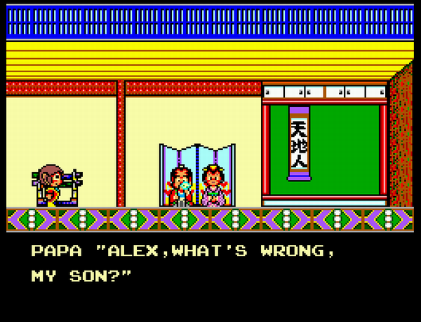 Al apretar el botón de Start vemos que Alex Kidd no está en un mundo de alta tecnología, sino encerrado en un castillo feudal japonés. Nuestra misión: salir de ahí para llegar a un salón recreativo recién inaugurado (ahí tenéis el supuesto High-Tech World), pero extrañamente no hay ni rastro de los saltos y los puñetazos que todos esperábamos, sino que para escapar hay que reunir 8 trozos de un mapa dispersos por la fortaleza. ¿Y la acción? No la hay, la primera parte de Alex Kidd in High-Tech World es una especie de juego de aventura, en el que hay que solucionar enigmas y resolver puzles para encontrar las 8 piezas y salir en busca del salón arcade.
